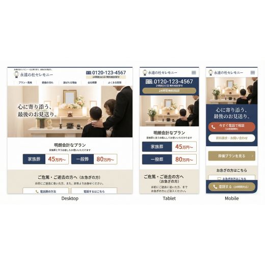 大きな画面を活かし、メインビジュアルで温かい家族の葬儀の様子を伝え、安心感を与えます。