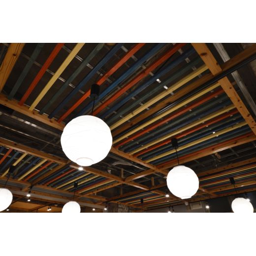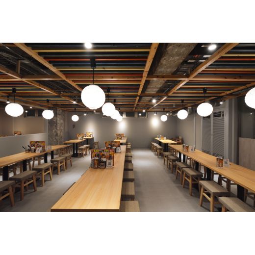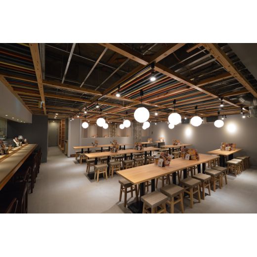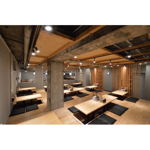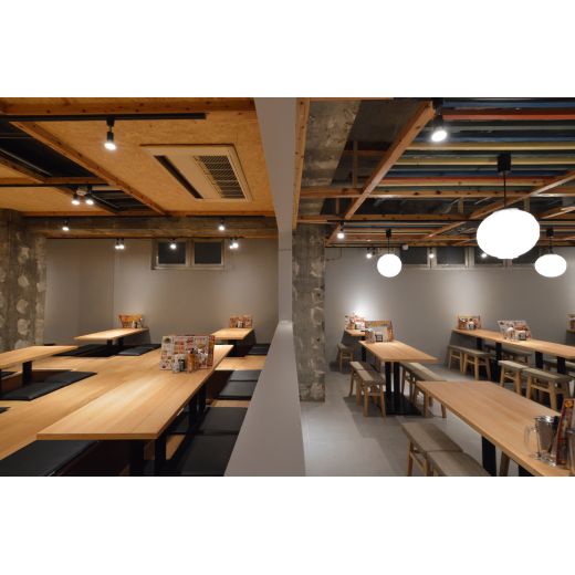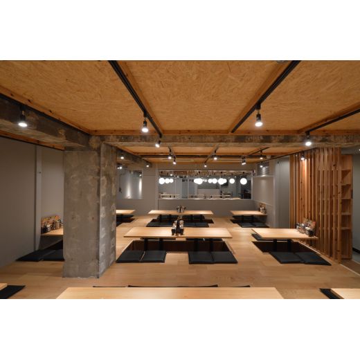 東京江戸川区にある大衆居酒屋「とりいちず小岩北口店」の改修計画である。テナントビルはRC造だが、改修前の内装には化粧柱や欄間が施されており、まるで木造のような昔ながらの和の趣が感じられた。そこで、改修では天井に木を最大限に活用することで既存の和のテイストを継承しながらも新たな空間へと再構成することを目指した。テーブル席と座敷席を設けることが要望であったため、それぞれ異なる性格を持つ空間としながら両方のスペースの天井には新たに木フレームを計画し、既存天井は撤去することでRC造のフレームをあえて露出させ、新旧の時間の経過を感じられる空間とした。テーブル席は大衆的で賑わいが感じられる場となるよう、客席上部の木フレーム間にカラフルなルーバー天井を設置し、活気ある場とした。また座敷席は落ち着いた印象とするために天井高を低めに設定し、客席上部の木フレーム間には、荒々しいコンクリート梁と呼応するかのようにOSB板を採用した。全体としてはグレートーンで落ち着いた印象を持たせつつ、カラフルでポップな要素を取り入れることで大衆らしい賑やかさと落ち着いた座敷の両方の顔を持つ、新たな大衆居酒屋スタイルの試みである。