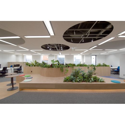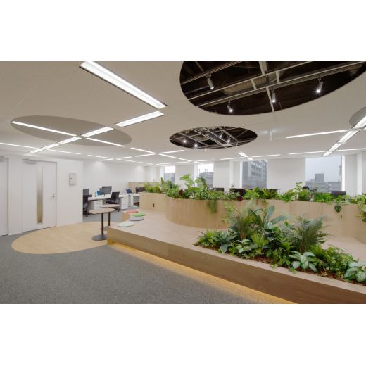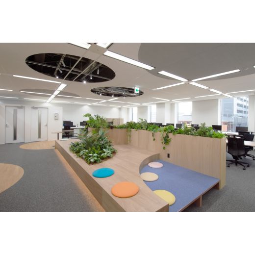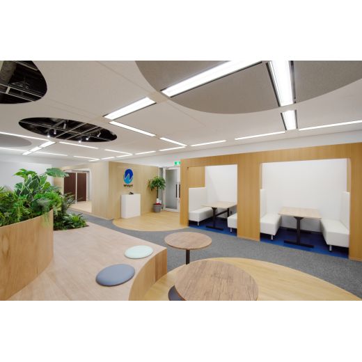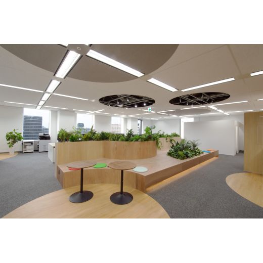 大阪市淀川区のオフィス移転に伴う内装計画である。これまでのオフィスは、執務に特化した空間構成だったため、自然なコミュニケーションが生まれにくい課題があった。そこで今回は、空間の中心に“ステップラウンジ”を設けることで、人が集まり自然に会話が生まれるような新しいオフィスのかたちを計画した。ラウンジは円の形によって居場所がつくられ、腰掛けやすい高さに設定することで、自然と人が寄りつきスタッフ同士のコミュニケーションが偶発的に生まれるようなデザインとしている。靴を脱いで過ごせる座敷のようなスペース、カジュアルな打ち合わせや立ち作業にも使えるカウンタースペースを組み込み、ワークスタイルに応じた多様な使い方ができるよう計画した。床仕上げは、極力コストを抑えるためにも既存のタイルカーペットを活かしつつ、一部を円形に切り替えることで空間にやわらかさとリズムを与えた。また天井にも対応するように円形の抜きや塗装のアクセントを加えることで、空間全体に統一感と遊び心をもたらしている。空間の中心に生まれたこの”ステップラウンジ”が、働く人々の関係性をやわらかくつなぎ直す新しいオフィスの核となることを目指した。