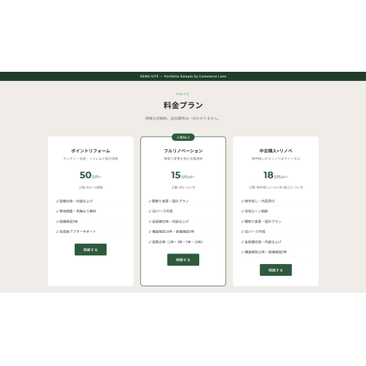 - リフォーム・リノベーション業界向けのLP型サイトをデモとして制作。「中古マンション x リノベーション」をコンセプトに、施工事例・料金プラン・ご相談の流れ・問い合わせ導線を1ページに集約。ヒーローセクションで信頼数値(施工実績・顧客満足度・創業年数)を提示し、選ばれる理由・事例・料金・CTAの導線で構成しています。PC・タブレット・スマートフォンすべてに対応したレスポンシブ設計です。