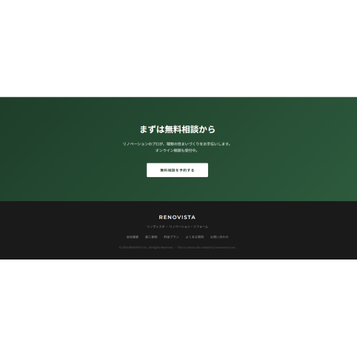 - 本実績はサービス品質を示すためのデモサイトです。架空の会社「リノヴィスタ」を想定し制作しました。実際のクライアントワークではありませんが、構成設計・デザイン・コーディングの品質は実案件と同等です。