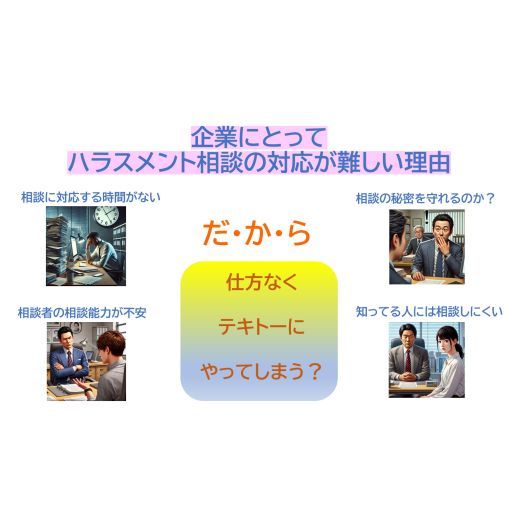 中小企業・小規模事業所では処罰型のハラスメント対策が悪影響を及ぼしやすいので、離職予防と心理的安全性を重視する職場では円満解決型のハラスメント対策を推奨しています。 20年 …