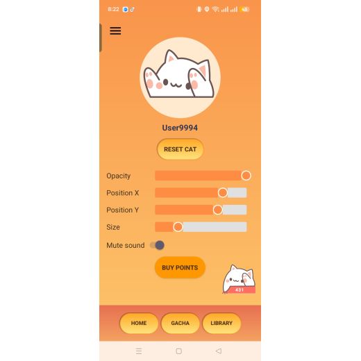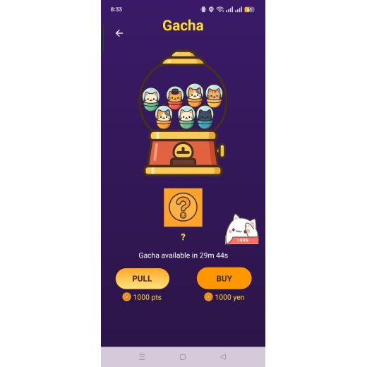新しいネコスキン、ポーズ、アクセサリーなどを解放できるガチャ画面