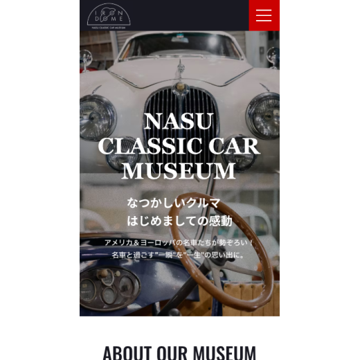 - 那須クラシックカー博物館様のWebサイトでは、展示車両の魅力・施設の楽しみ方・来館案内情報 が直感的に伝わることを目的に、企画設計から制作まで一貫して担当しました。トップページから展示紹介、利用案内、アクセス情報まで整理し、視覚的な訴求を強化するために写真・動画撮影も行いました。