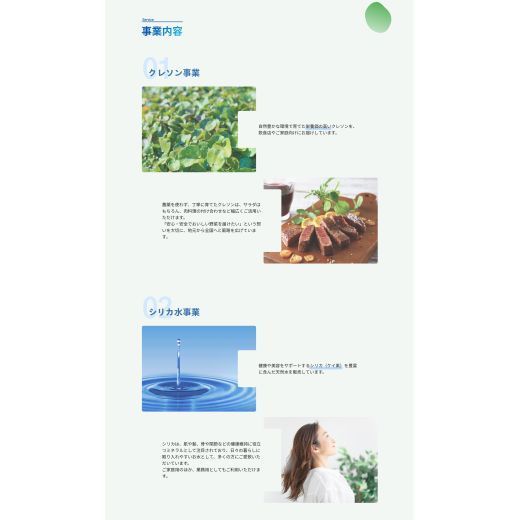 ・シリカ水とクレソン栽培が中心で、そのイメージに自然とつながるような雰囲気と信頼感のあるサイトとして制作いたしました。