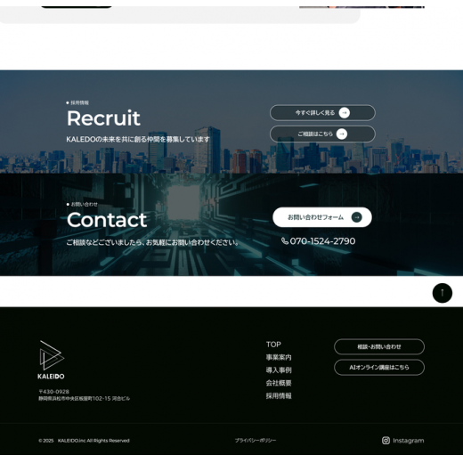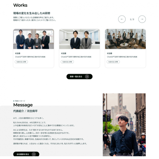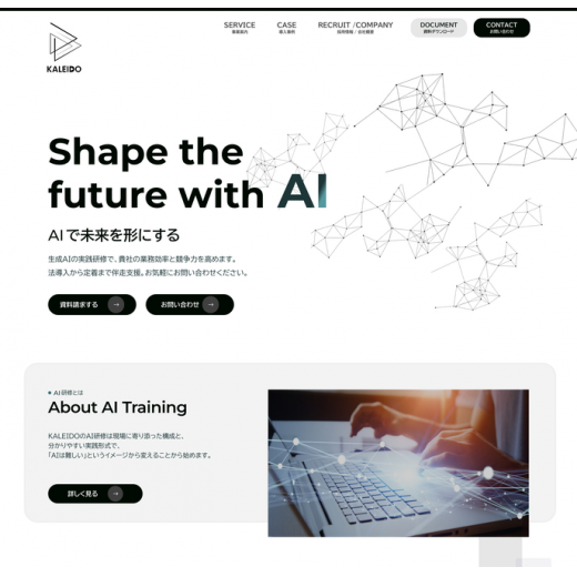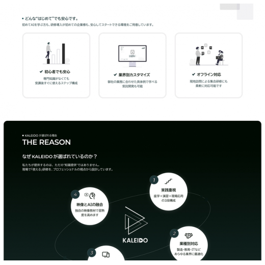 合同会社KALEIDO様の法人むけAI研修サービスサイト兼、コーポレートサイトのデザインを制作しました。