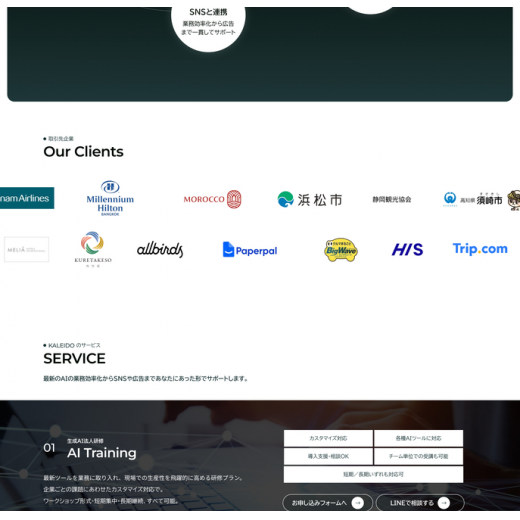 —— 合同会社KALEIDO様の法人むけAI研修サービスサイト兼、コーポレートサイトのデザインを制作しました。- 業種