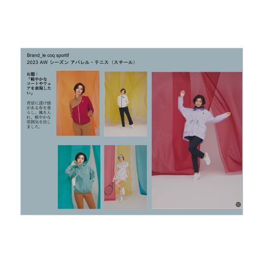 - フランスのスポーツブランド「le coq sportif」。ターゲットは本格的にスポーツをする女性から、ファッションとしてタウンユースする若年層。
