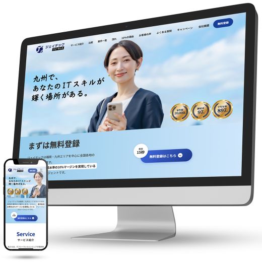フリーランスエンジニア向け案件紹介サイト「ジェイテックフリーランス」の制作を担当しました。 福岡・九州エリアに強いエージェントであることや、業界最高水準10%マージンといった強みが一目で伝わるように構 …