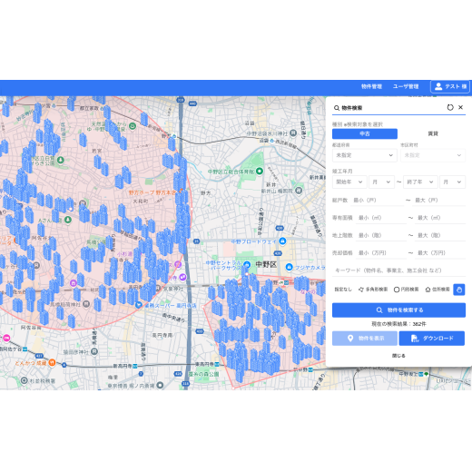 google mapと連携した物件管理システム。シンプルで使いやすいUIと500,000件以上のデータをスムーズに探すことができます。