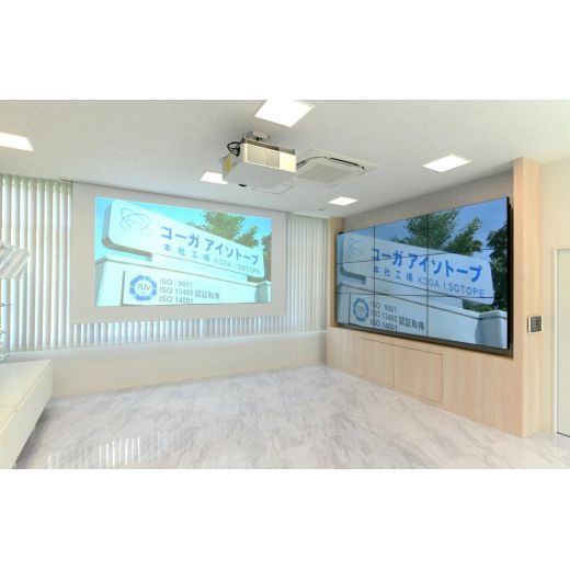 会議棟のエントランスにプロモーション用のプロジェクター設備と9面マルチディスプレイを導入させて頂きました。