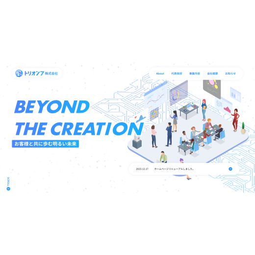 - トリオンフ株式会社様のコーポレートサイト制作。アイソメトリックイラストを効果的に活用し、モダンで洗練されたデザインを実現。WordPressベースで構築し、更新性と拡張性を確保。