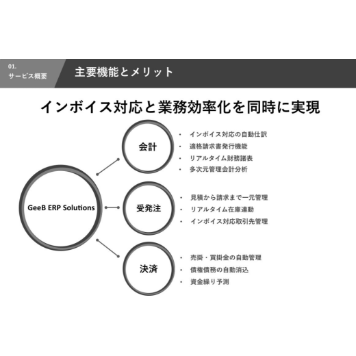 インボイス制度(2023年10月施行)に完全対応 オープンソースの活用により、コストパフォーマンスに優れたシステム構築 日本の商習慣に完全対応した統合的な業務管理を実現 会計・財務から受発注管理まで一元管理