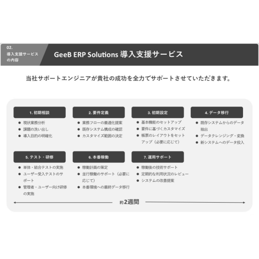 - 業務フロー分析、要件定義、システム導入支援、データ移行、システム管理者トレーニング、サーバー保守