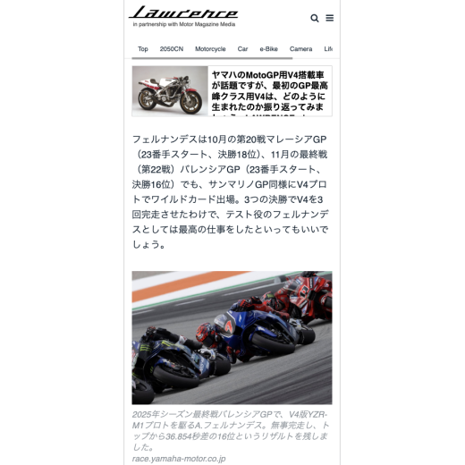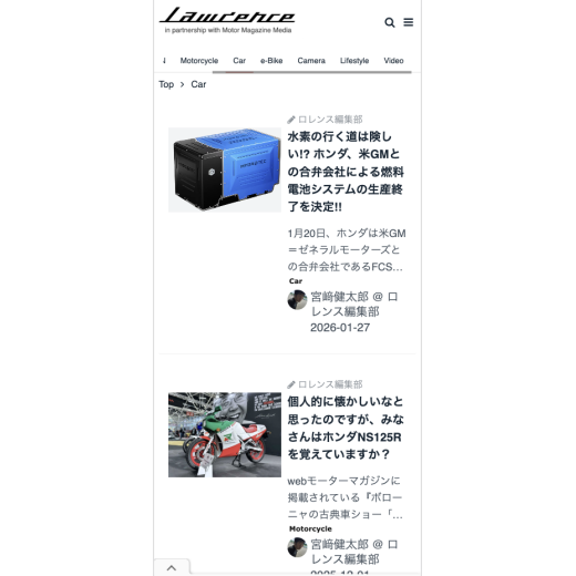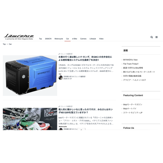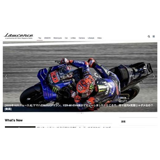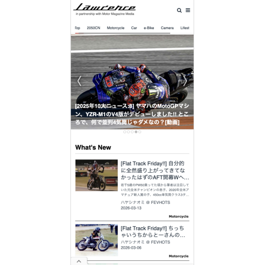ロレンスはモーターマガジン社の運営する「webモーターマガジン」、「webオートバイ」、「webカメラマン」、そして「スマートモビリティJP」に掲載されたコンテンツを紹介する、モーターマガジン社公式キュレーションサイトです。