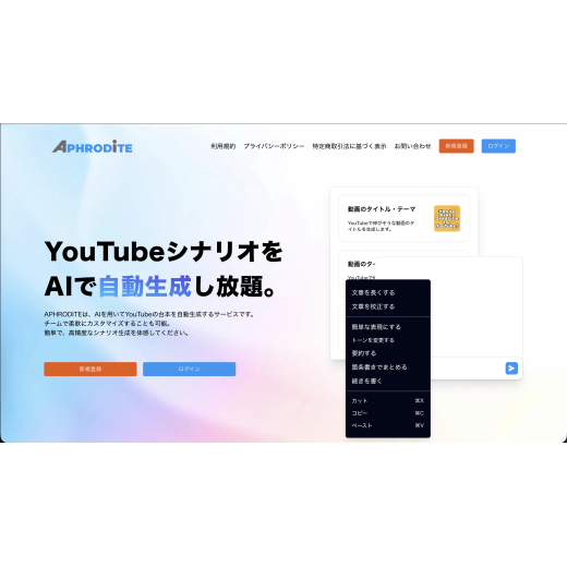 YouTubeには台本を作成する必要があり、その台本を作りでキーワードだけ入力すと、AIがそのキーワードに合わせてタイトル、サムネ、台本などを自動生成してくれるツールです。