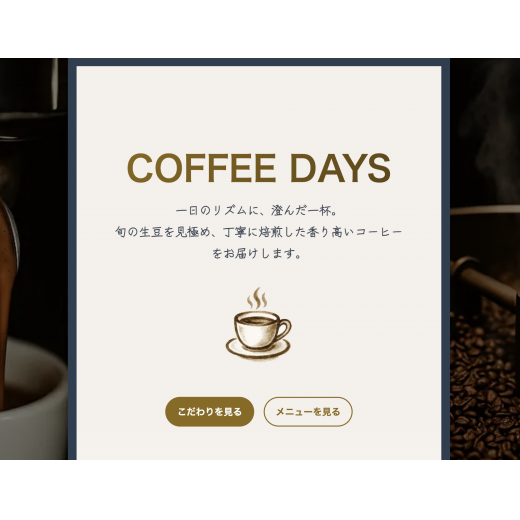 コーヒーショップ向けにブランドの世界観を重視したランディングページを制作しました。写真やビジュアルには生成AIを活用し、キャッチコピーやスクロール時のアニメーションと組み合わせることで印象に残るデザイ …