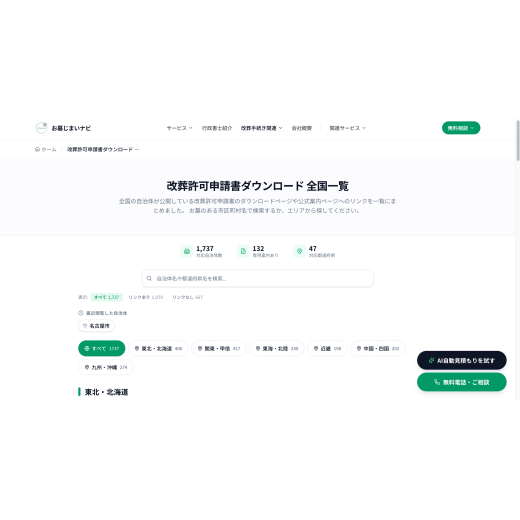単なる情報掲載サイトではなく、改葬許可申請導線を考慮したユーザー行動設計を実施。全国自治体データの構造化、管理画面構築、エリア検索機能、SEOを意識したルーティング設計まで一貫対応。