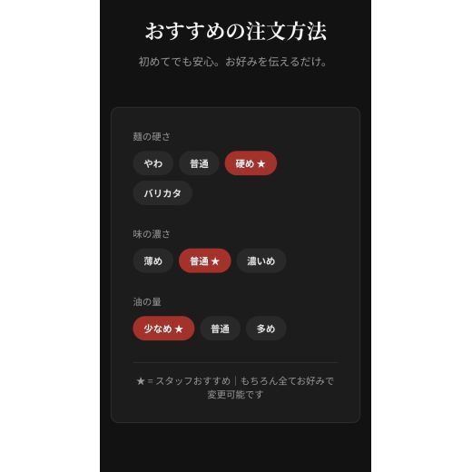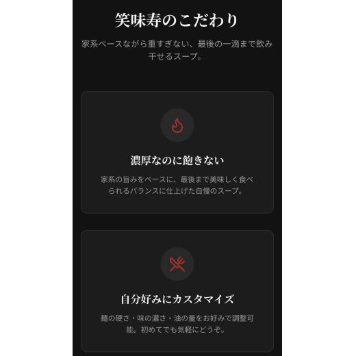 ラーメンのシズル感を活かしたビジュアルデザインと、黒を基調とした高級感のあるUI。