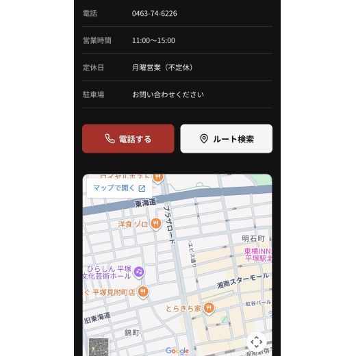 またスマートフォンからの閲覧を前提とした設計により、電話問い合わせや地図検索などの来店導線をスムーズにしています。