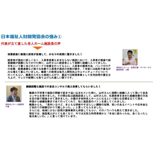 半年という驚くほどのスピードで改善を行ってもらい、入居者の獲得方法、パンフやHPの改善、医療連携など様々な改善で入居者が満床の状態が続き、1年後には給料や賞与がみな増えて喜んでいました。職員への教育は毎月人間性向上やユマニチュードについて行ってもらい、職員のスキルも格段に上がり、最近では新規事業として在宅訪問介護を立ち上げ、テレビや新聞にも取り上げられ嬉しい限りです。
