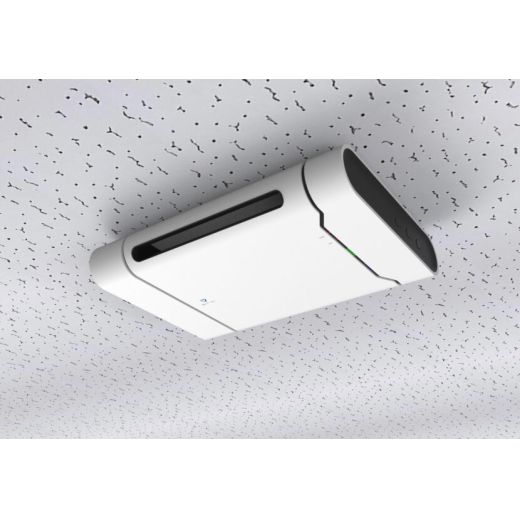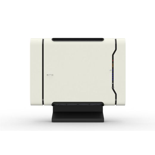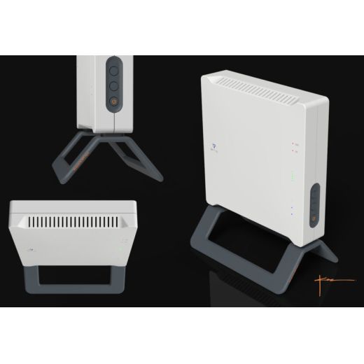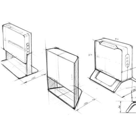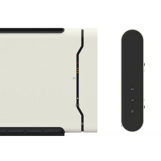 デザインのテーマは「フューチャリズム・モダン」です。いわゆる空気清浄機とは一線を画す、 光触媒による除菌と脱臭に特化した高性能な機器であるため、それを体現すべく、環境に程よく溶け込みつつも、 さりげなくオーラを放つデザインにしたいと考えました。形で拘ったところは、横から見るとオーバル型のシンプルな形状とし、 正面にはアクセントとして黒スリットを左右に配置し、少し折れた右側のスリット内には赤橙青のLEDインジケーターを設けました。 また本機は、本体下部から空気を吸い込み、本体上部に排気する構造となっているので、本体をフロアから浮かせる必要があったため、 専用スタンドを設けました。吸気口の妨げにならないように、板を折り曲げたようなシンプルな形状にしたのも特徴のひとつです。 取り外せば壁掛けも可能です。近未来の世界観を持ったスタンドアローンな製品があらゆるユーザーに満足感や充実感を与えます。