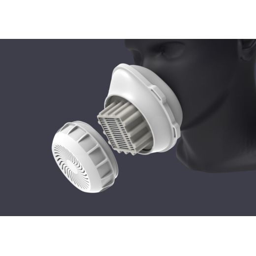 本製品の最大の特長でもある「N95」に対応すべく開発された高性能フィルターを顔の最適な位置に配置し、より簡単・確実に脱着できるよう設計。また、装着時の不快感を少しでも軽減できるよう軽量コンパクトにまとめました。さらには、個人差のある顔の大きさに対して、より多くの人にフィットするように顔に触れる部分にはゴム部品を使い、空気の漏れがないことはもちろん、長時間使用しても痛みや不快感の少ない仕様を提案しました。また、金型製作までスムーズに進めるよう、設計段階から、成形業者とともに、量産を見据えた設計をご提案。量産化までの期間短縮に努めました。