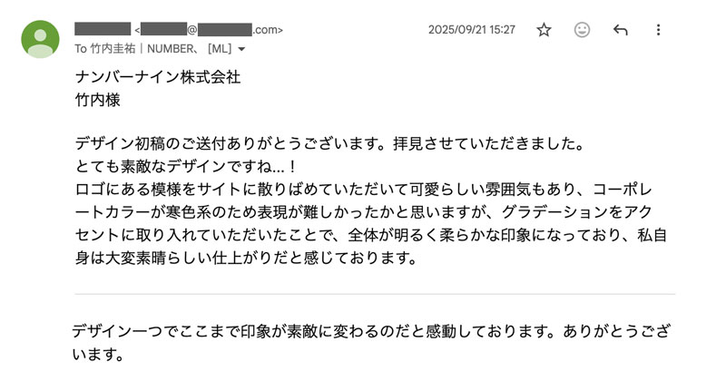 制作では、納得がいくまでデザインの方向性をすり合わせました。その結果、「大変素晴らしい仕上がり」との嬉しいお言葉をいただき、納品時には「ここまで印象が変わるとは」と感激のメールをいただきました。