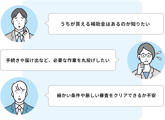 補助金は手続きが複雑で、自分で申請しようにも採択されるための条件を知らないと、審査が通らない可能性があります。 そのため、専門家に相談するのがオススメです!